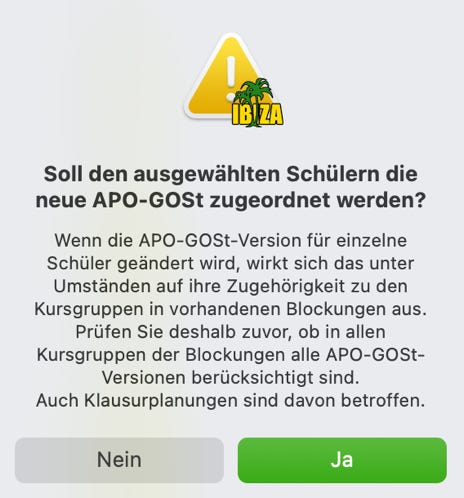 Wenn Sie mit dem Knopf die Eintragung der APO-GOSt-Version für die ausgewählten Schüler veranlassen, werden Sie sicherheitshalber auf Probleme hingewiesen, die durch die Änderung entstehen können.