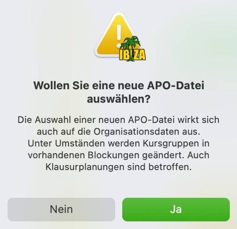 APO-Dateien sind von unserer Seite stets so bezeichnet, dass Sie erkennen können, welche APO-Datei Sie ihrem Jahrgang zuweisen müssen. Diese Zuordnung geschieht dann, wenn Sie eine neue IBIZA-Datei anlegen. Zur IBIZA-Datei „Abitur 2026“ gehört dann die APO-Datei „APO-NRW Abitur 2026.apo“. In dieser Datei befinden sich alle APO-GOSt-Varianten, die evtl. Schülerinnen und Schülern dieser Jahrgangsstufe zugeordnet werden müssen, weil Sie unterschiedliche Laufbahnen durchlaufen haben.