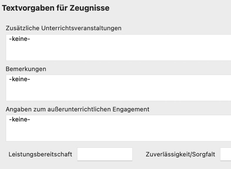 Einige Textbausteine, die auf Zeugnissen erscheinen, sind in IBIZA vorgegeben. Sie können hier Textvorgaben machen, die dann für einzelne Schüler*innen im Schülerfenster und dort für jedes Halbjahr individuell angepasst werden können.
