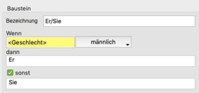 Wie im Formularfenster wählen Sie aus der Inhaltstabelle einen der dort angebotenen Bausteine. Wenn Sie einen Baustein anklicken, wird er automatisch in das gelbe Textfeld übernommen und verschiedene Bedingungen werden zur Auswahl gestellt.